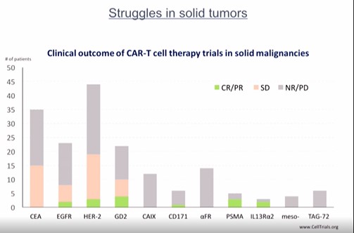 2017年以來,美國食品藥品監(jiān)督管理局接連批準諾華公司的Kymriah 和 Kite 制 藥 的 Yescarta上市,使CAR-T 療法開始出現(xiàn)在大眾視野,并逐漸成為最具前景的腫瘤治療方式之一。近年 CAR-T在血液系統(tǒng)腫瘤治療,尤其是靶向CD19 CAR-T在急性難治型淋巴細胞白血病治療中,取得了矚目成就。然而,CAR-T在實體瘤的攻堅上仍處于一個初期階段。按照雷博士的話說,為數(shù)不多的靶點,腫瘤微環(huán)境、腫瘤異質(zhì)性、On Target Off-tumor所導(dǎo)致的副作用都是限制CAR-T療法在實體瘤領(lǐng)域發(fā)揮的重要因素。