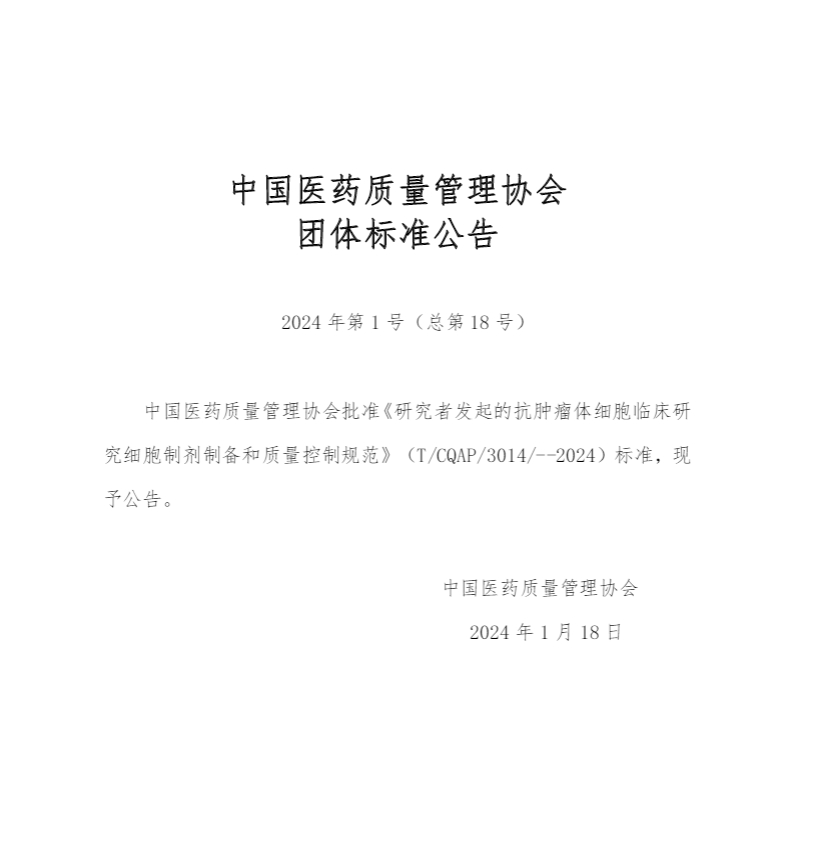 2024年5月1日,由中國(guó)醫(yī)藥質(zhì)量管理協(xié)會(huì)發(fā)布的《研究者發(fā)起的抗腫瘤體細(xì)胞臨床研究細(xì)胞制劑制備和質(zhì)量控制規(guī)范》(T/CQAP 3014—2024)標(biāo)準(zhǔn)(以下簡(jiǎn)稱“標(biāo)準(zhǔn)”)將正式實(shí)施。