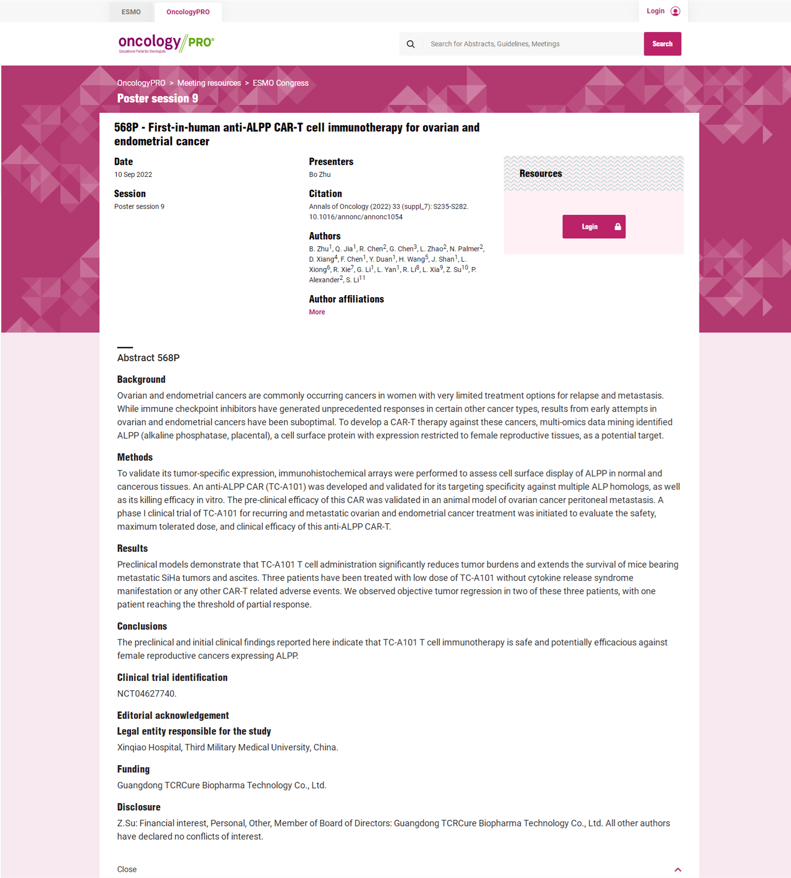 臨床前和初步臨床研究結(jié)果表明,TC-A101 T細(xì)胞免疫療法對表達(dá)ALPP的女性生殖癌是安全且潛在有效的。