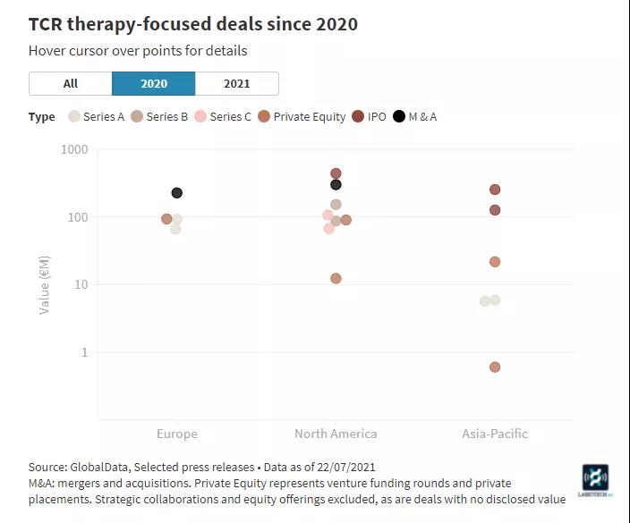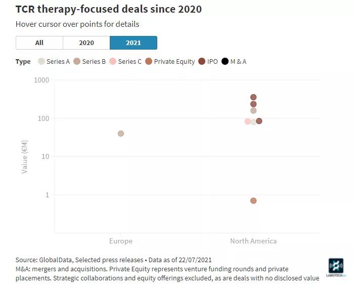 然而在2021年上半年,歐洲卻很少有開發(fā)商對(duì)TCR-T進(jìn)行風(fēng)險(xiǎn)投資,同樣在亞洲也是如此。但是這一現(xiàn)象與美國形成鮮明對(duì)比,美國至少獲得了三輪由TCR-T公司的籌集的風(fēng)險(xiǎn)投資,并且TCR-T開發(fā)商在美國也進(jìn)行了多次首次公開募股。最近一次是TScan Therapeutics以8500萬歐元的價(jià)格完成資金募集。